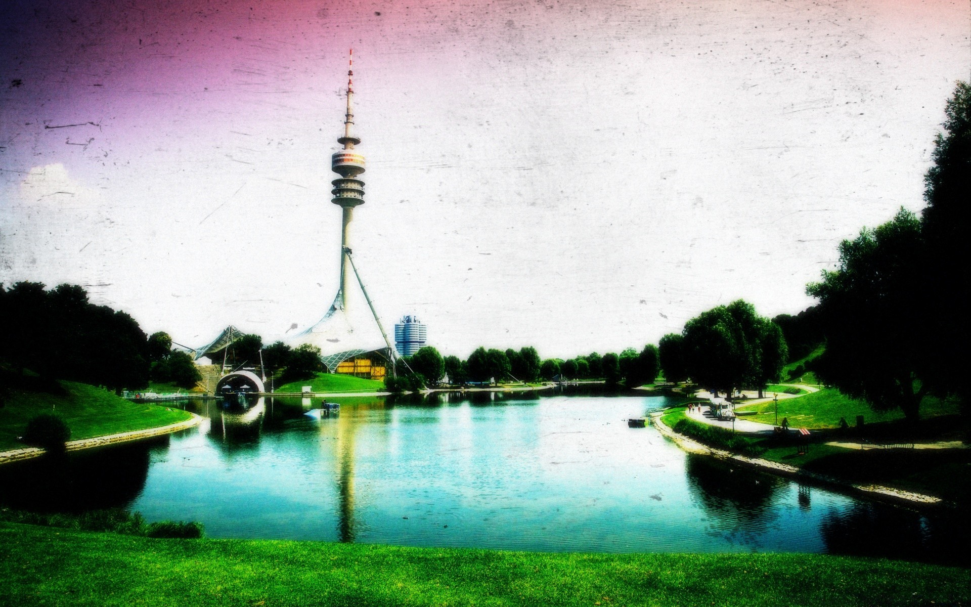 Водойма в парку з незвичайною будовою - шпалери на телефон