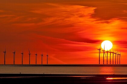 Сонце на заході сонця, вітряки