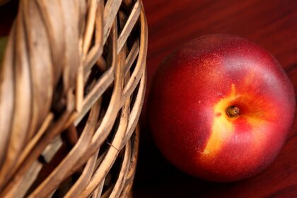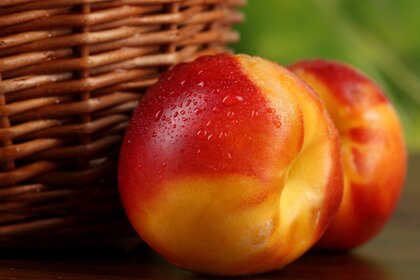 Соковиті нектарина з крапельками води на тлі плетеного кошика
