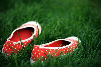 Червоні в білих горошках тапочки на зеленій траві