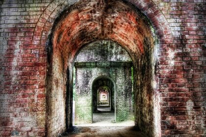 Наскрізна склепінчаста арка старовинного будинку з червоної цеглиНаскрізна склепінчаста арка старовинного будинку з червоної цегли