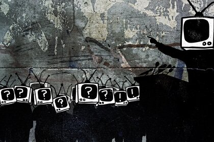 Графіті на сірій бетонній стіні, що зображує людей з телевізорами замість голівГрафіті на сірій бетонній стіні, що зображує людей з телевізорами замість голів