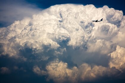 Маленький літак на тлі величезної хмари