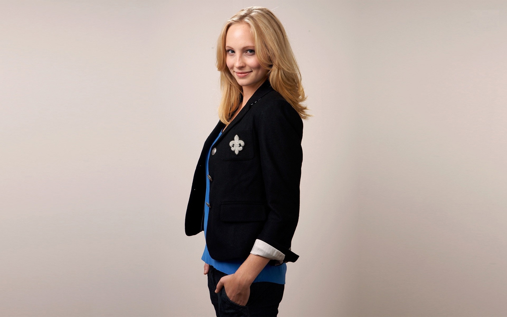 Блондинка позує в чорно-синьому костюмі - шпалери на телефон