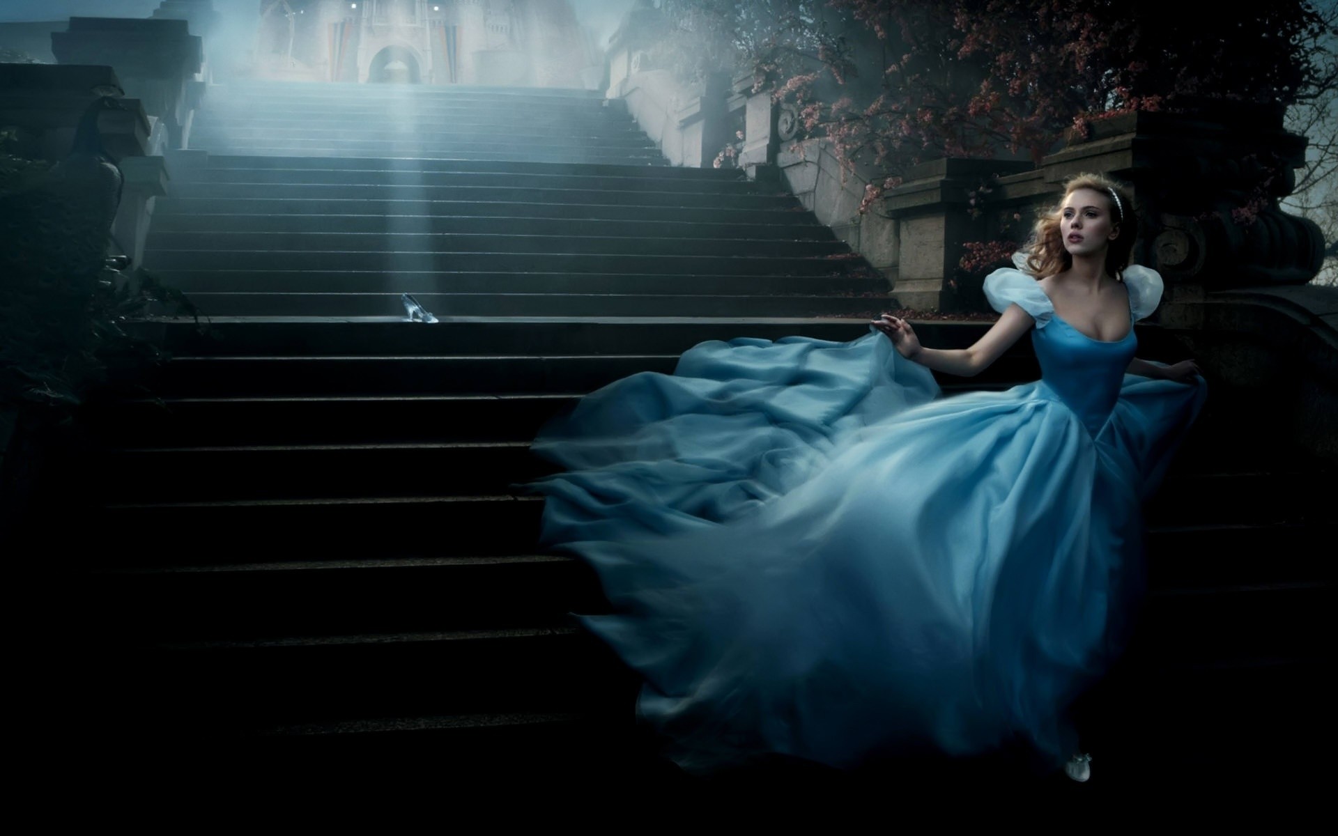 Дівчина в блакитному довгій сукні біжить по сходах