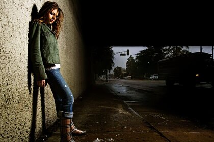 Дівчина в гумових чоботях на нічному паркінгу