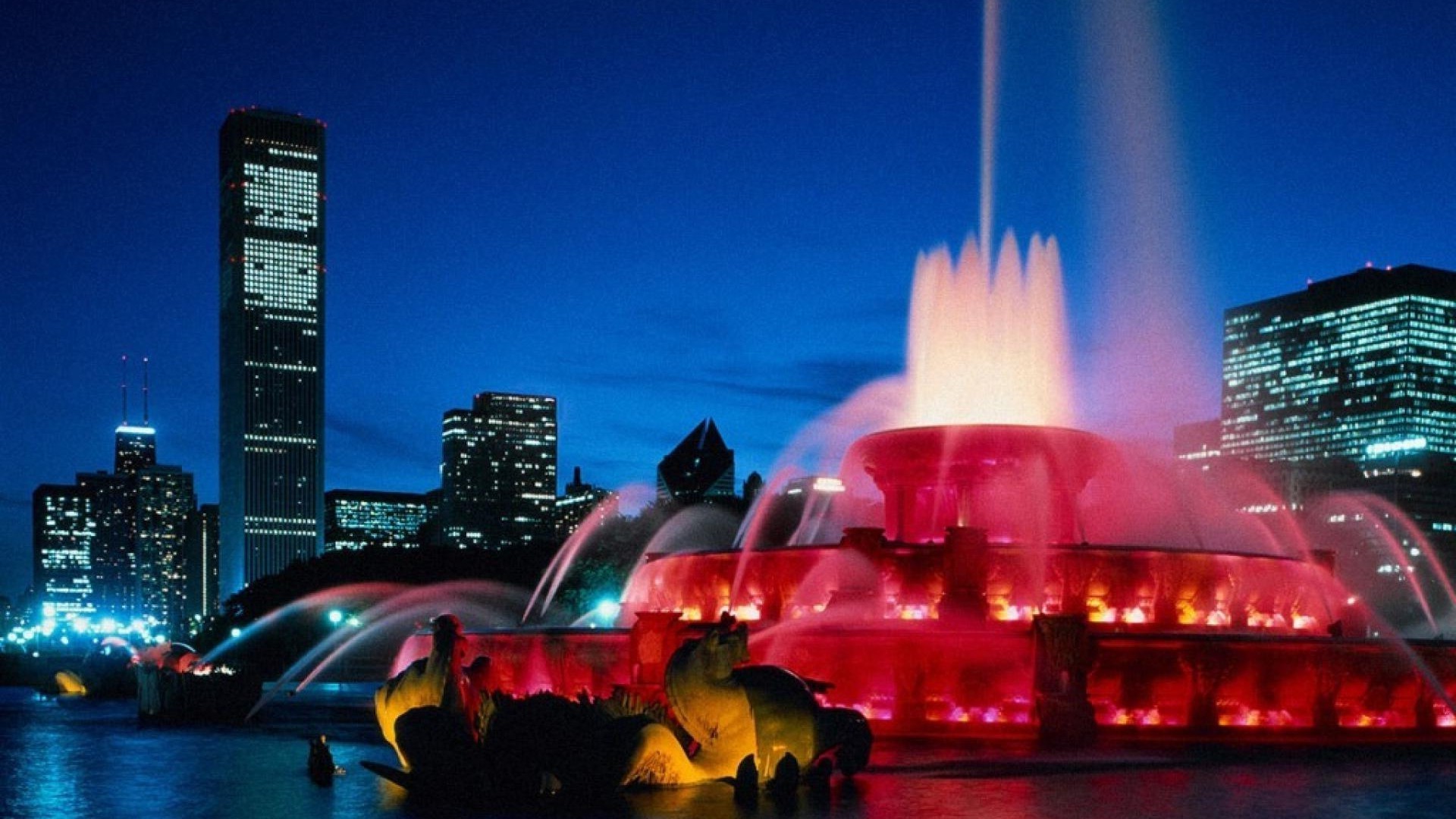 Вогні міського фонтану серед хмарочосів - шпалери на телефон