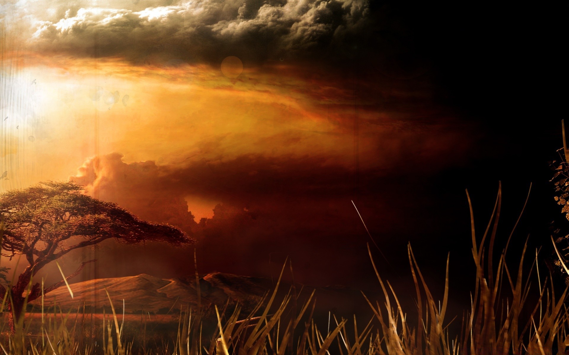 Чоловік зі зброєю на тлі вогню і африканської природи