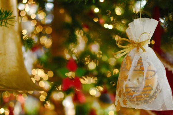 Макро зйомка ялинки з іграшками та гірляндами
