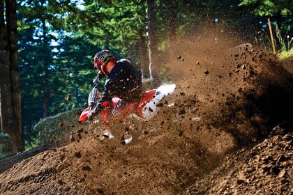 Спортсмен на помаранчевому байку красиво управляє