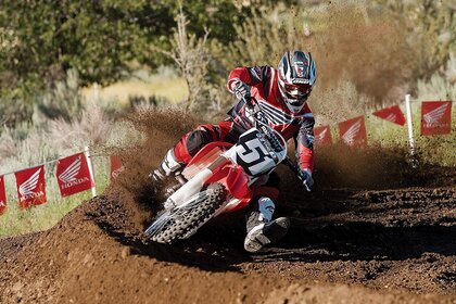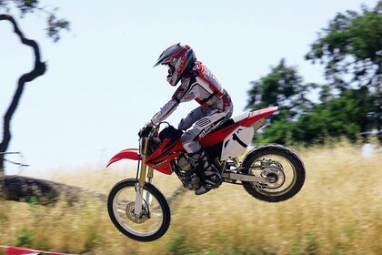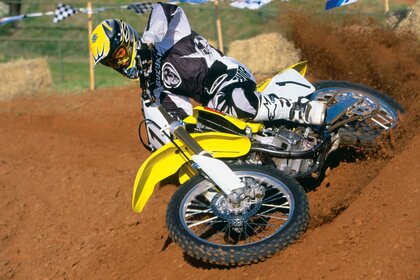 Жовтий мотоцикл з гонщиком з'їжджають в гірки