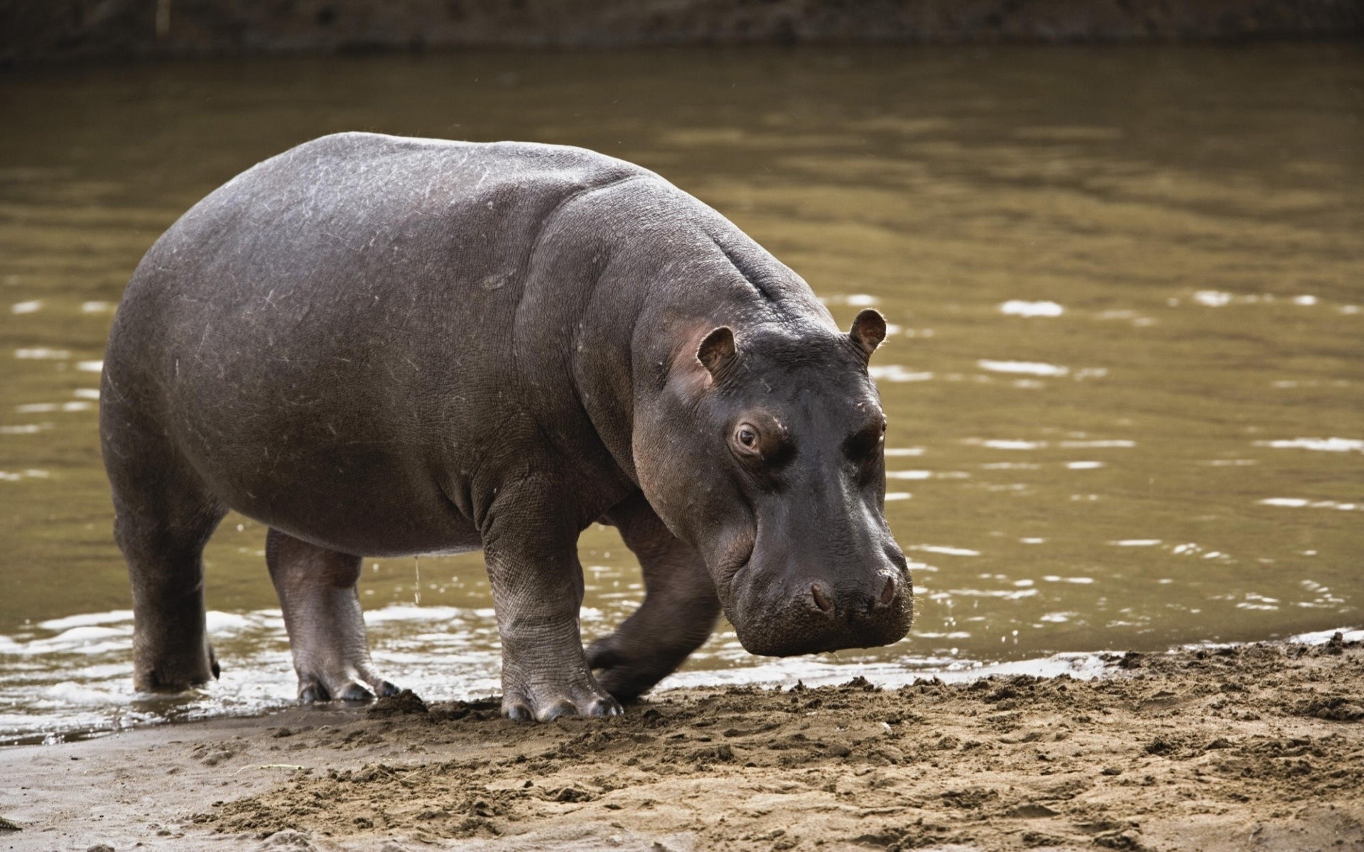 Бегемот виходить з брудної води