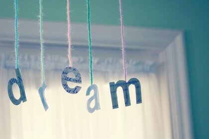 Букви підвішені на різнокольорових нитках