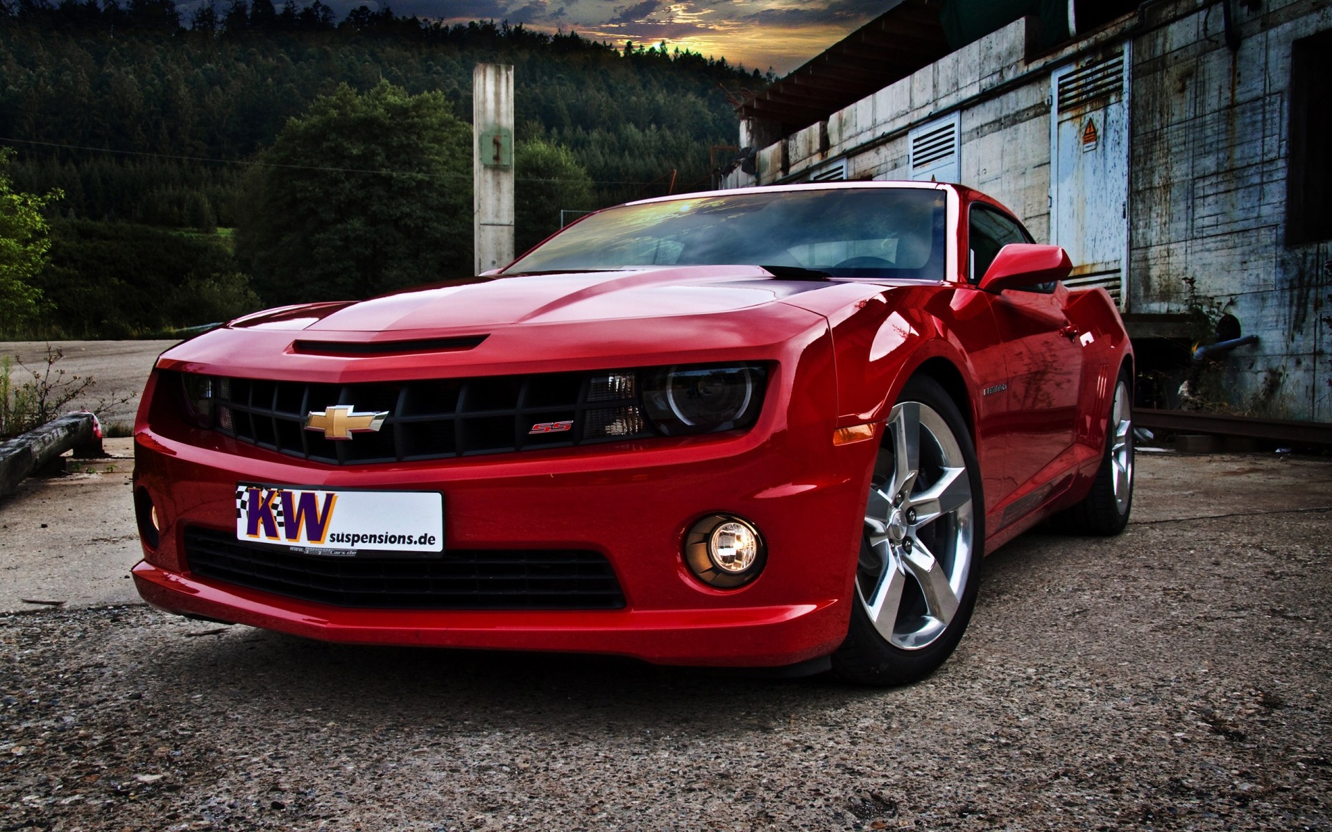 Червоний шевроле і його відображення в калюжі на тлі гірЧервоний Шевроле і його відображення в калюжі на тлі гір
