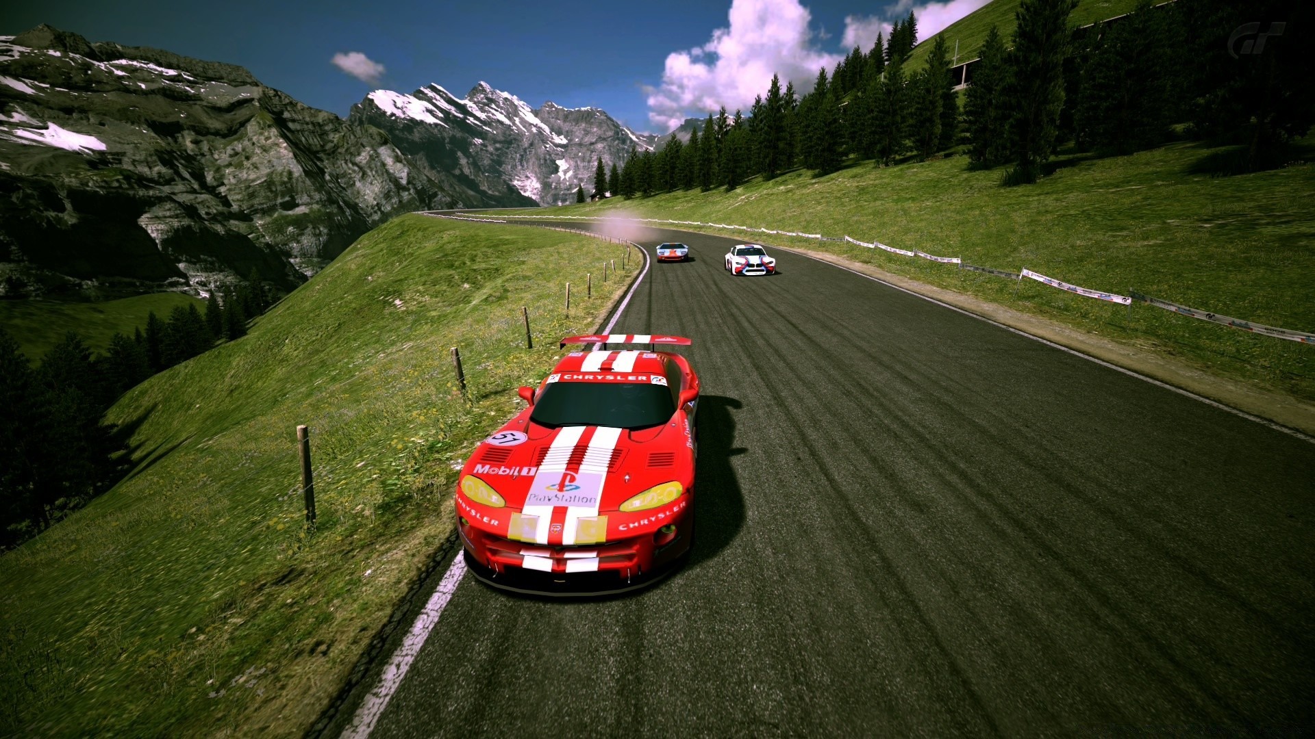 Спортивний автомобіль червоного кольору на дорозі в горахСпортивний автомобіль червоного кольору на дорозі в горах