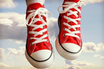 Червоні кеди на дерев'яному тлі і напис зі шнурків 365