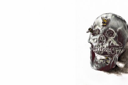 Страхітливий людський череп, по якому повзають осиСтрахітливий людський череп, по якому повзають оси