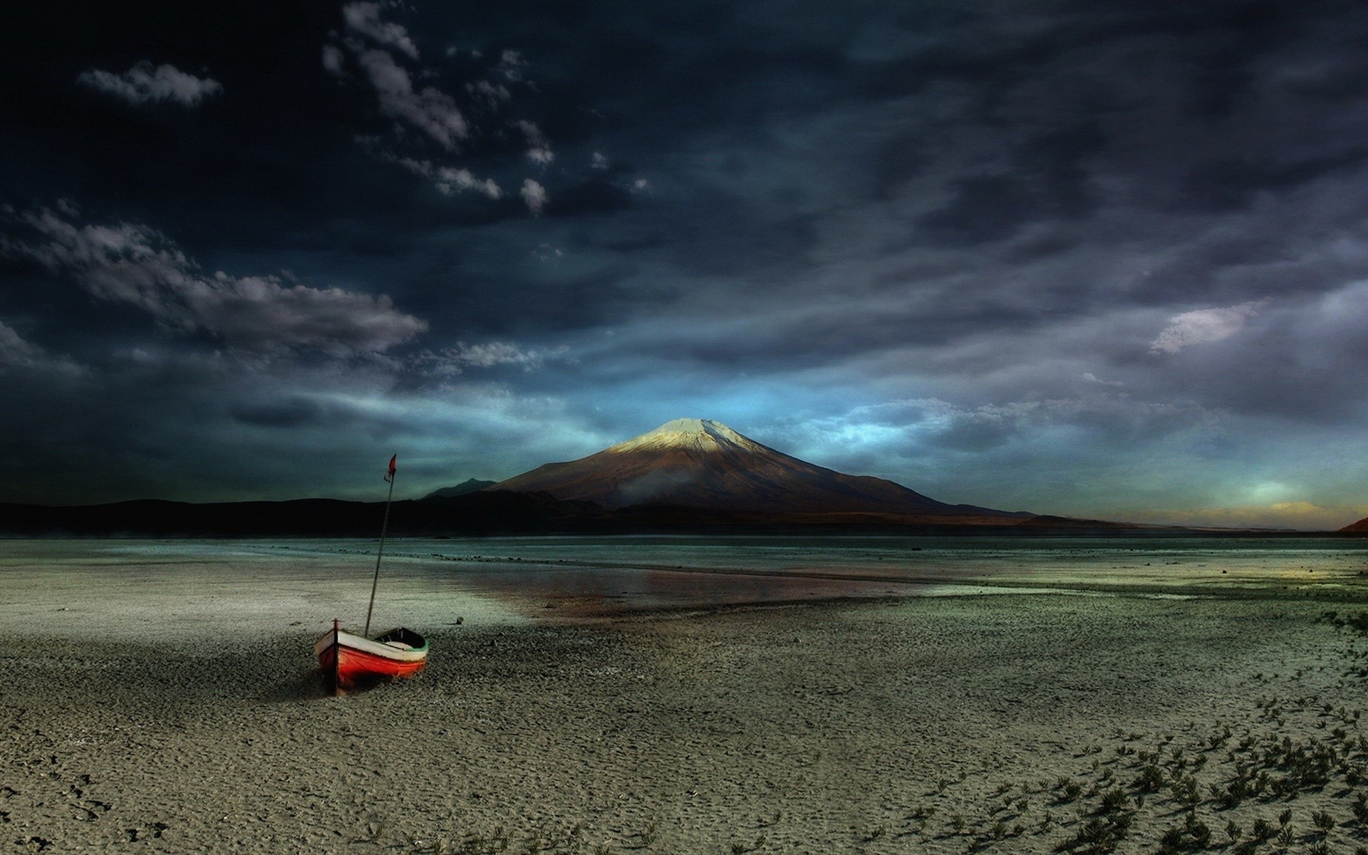 Пляж з самотнім човном на заході сонця